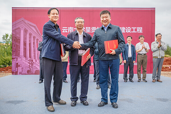 仪式上,林文勋、王庆、陈云丰分别代表云南大学、云南省建设投资控股集团有限公司、云南省设计院集团相互交换建设项目工程总承包合同文本。