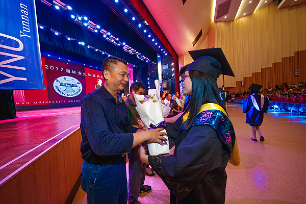 在学生们努力学习、奋发向上的时候,父母、亲人以及工作在服务岗位一线的教职工们也在为学生们付出了许多。典礼上,毕业生为父母、亲人、教职工代表献上饱含深情的鲜花,感谢父母亲人的养育之恩,感谢云大每一位关心、关怀、帮助过的人,让他们一同见证成长、分享喜悦。