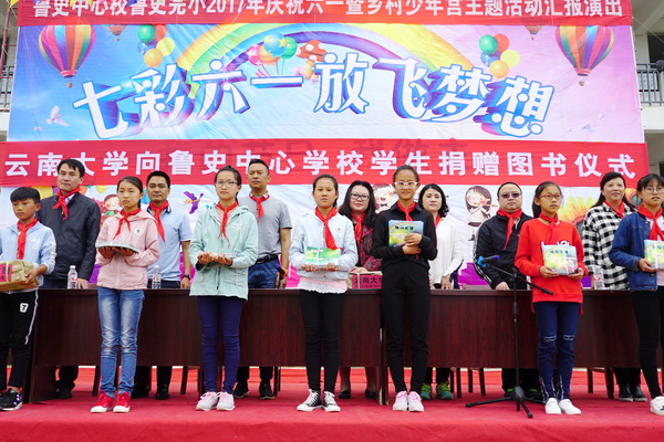 讲座结束后,调研组来到鲁史中心校,为正在欢度“六一儿童节”的小学生表达了节日的问候,将《一缕阳光》儿童图书绘本作为“六一儿童节”的礼物赠送给同学们。