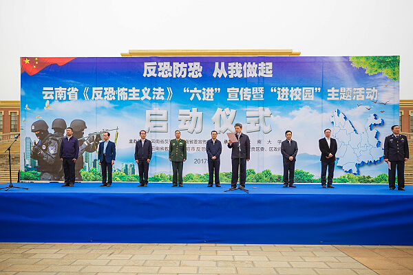 4月16日,省反恐办、省委宣传部、省教育厅、昆明市反恐办联合在云南大学呈贡校区举行《反恐怖主义法》“六进”宣传暨“进校园”主题活动启动仪式。