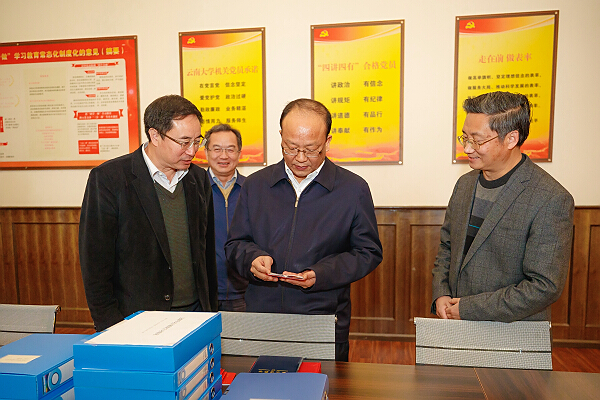 走进宽敞明亮的机关党委党员活动室,李小三查看了悬挂在墙上的云南大学党建相关规定,查阅了机关党委的党费收缴情况登记和组织生活痕迹材料。李小三还对云南大学结合学校党员工作实际,编写《党员常识100》、《党务常识100》的举措给予了赞许。
