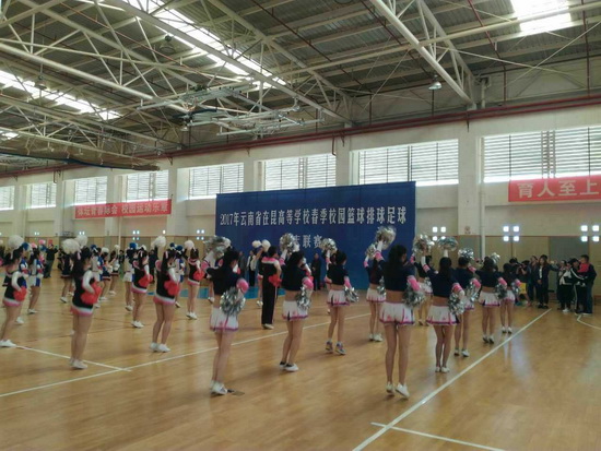 3月24日,由云南省教育厅主办的2017年在昆高校春季校园篮排足球周末联赛在昆明理工大学体育馆拉开帷幕。云大体育学院院长李国忠带领男女排队员及100名体育学院啦啦队员参加了开幕式。