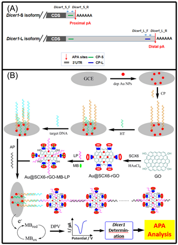图1  APA机制调控Dicer1基因产生不同的转录本(A)及其电化学检测原理(B)