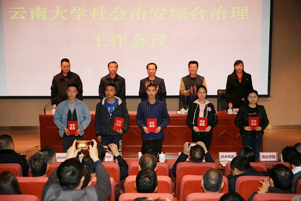 学校综治委办公室副主任、安防中心主任刘碧清就学校2016年度社会治安治理工作做了总结,并对今年工作进行了布署。省教育厅后勤保卫处叶家鸿副处长宣读了云南大学2016年度社会治安综合治理工作先进个人表彰决定。主席台就坐的与会领导为受表彰的校护卫队、后勤、宿舍管理、物业管理等工作人员,以及学生代表等颁发了荣誉证书。