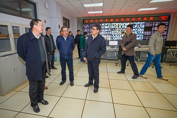 在多媒体网络教学系统监控室,李晓红通过远程终端操作等方式,随机抽取了正在上课的教室监控视频,听取教务处、信息技术中心负责人对目前各门课程开课情况、信息技术支持等方面情况的汇报。在视频监控中看到各个教室中井然有序的课堂纪律、师生专心致志的上课状态,李晓红对云南大学师生表现出来的优良教风、学风给予了赞许。