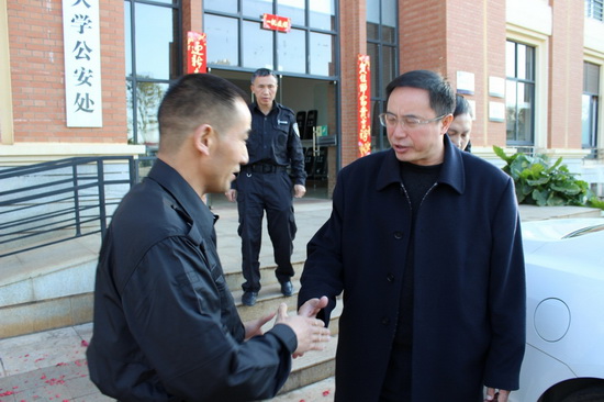 杨林向春节期间依然工作在一线的广大干部职工致以节日的问候,感谢他们为假期间学校的平安和谐、稳定有序所做出的贡献,并详细了解了假期间学校安全保卫、后勤服务、医疗保障等方面的情况。杨林还与坚守岗位的干部职工共进除夕夜晚餐,共祝农历丁酉年新年的到来。