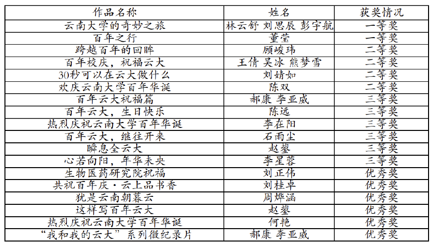 现对拟获奖作品名单进行公示,公示期为5月29日—6月2日,如有异议,请在此期限内向云南大学党委宣传部(含新闻中心)反映。